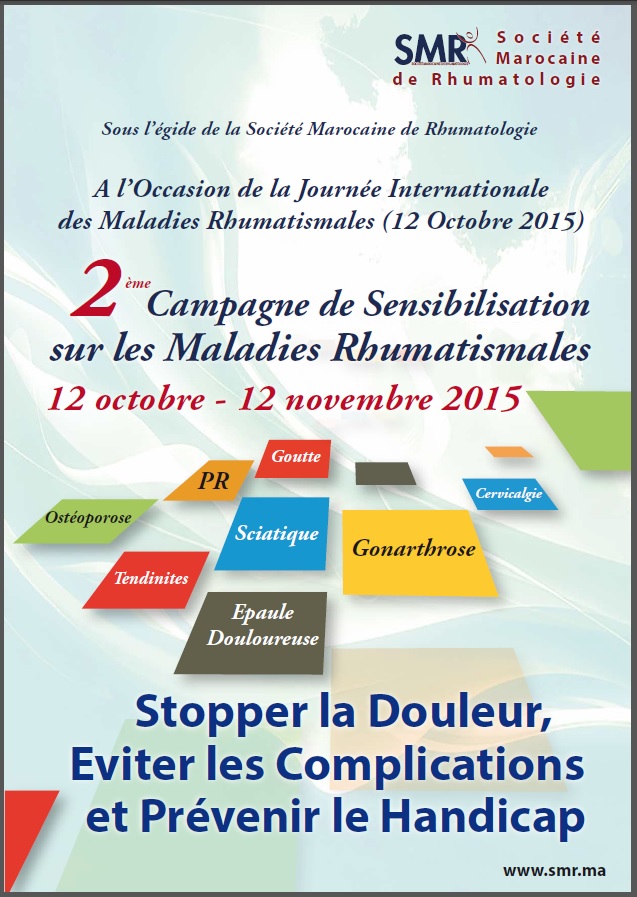 Reconnaître de manière précoce les maladies rhumatismales les plus fréquentes, pour stopper la douleur, retarder les complications et éviter les déformations et le handicap, se sont les messages clés de la Campagne d’information sur les maladies rhumatismales, organisée du 12 octobre au 12 novembre 2015, par la Société Marocaine de Rhumatologie, qui coïncide avec la Journée Mondiale contre les Maladies Rhumatismales (12 octobre 2015).